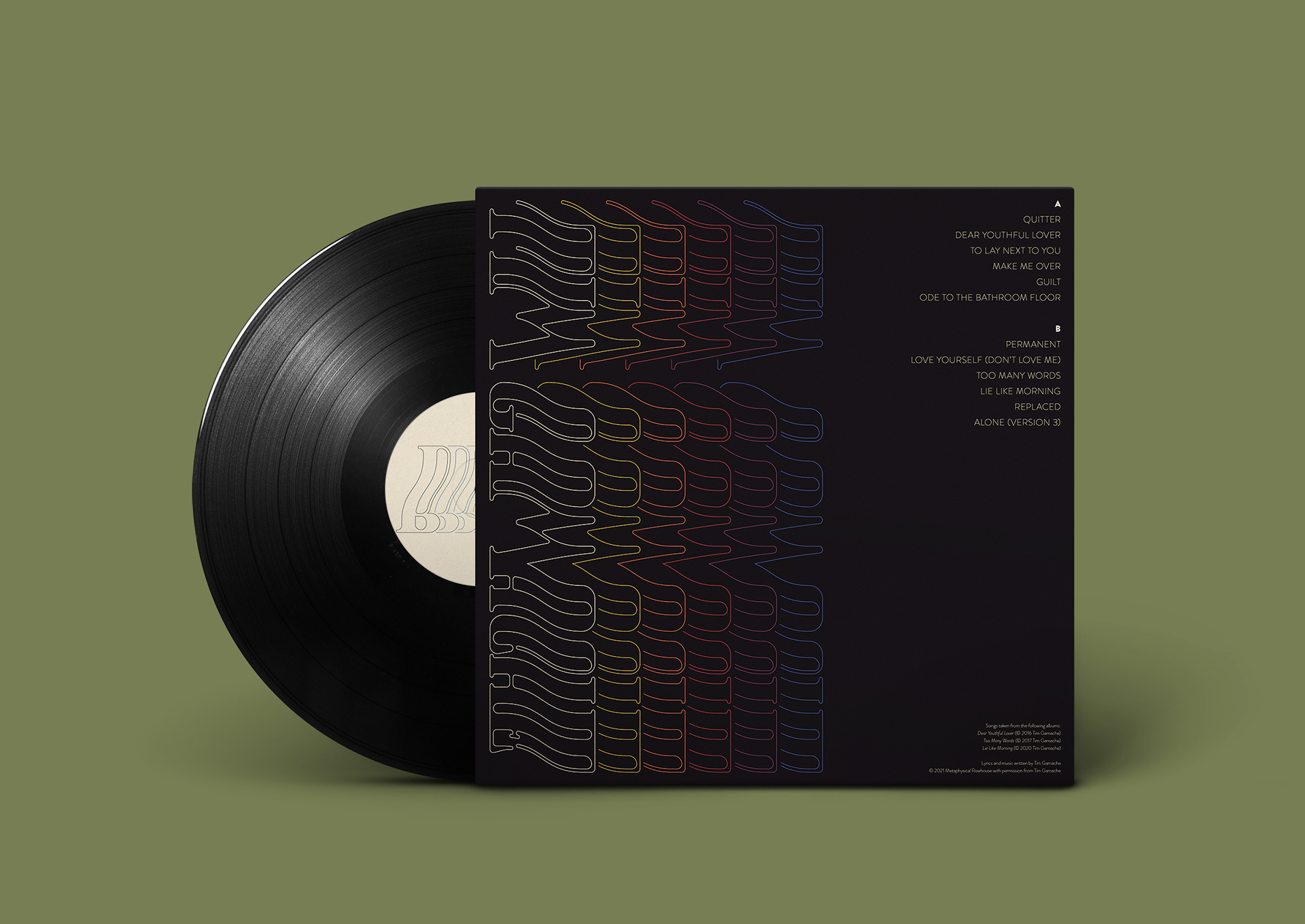 A design study created for long-time musical collaborator Tim Gamache. It is an unreleased "best of" LP that compiles selected tracks from their first three records. The album art features a unique vintage-inspired font made from scratch, and a warm color palette to match the atmosphere of the songs. There is a beautifully laid out insert as well, with the lyrics of all of the songs.